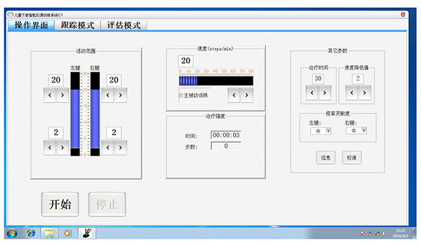 根據(jù)病人的自身情況(年齡、身高、體重、健康狀況等)設(shè)置系統(tǒng)參數(shù),針對不同病情康復訓練治療,基本的參數(shù)有步幅,步頻,治療時間,痙攣靈敏度等;