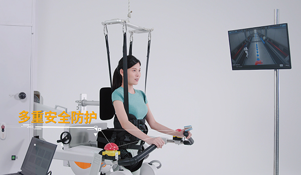 步態(tài)訓練與評估系統 A3-2,是一款針對步行功能障礙進行高效康復訓練的下肢康復機器人。產品由計算機控制系統、步態(tài)矯正裝置系統、動靜態(tài)減重系統、醫(yī)用跑臺系統以及情景互動訓練系統五大模塊組成。它可以使患者在直立體位下通過不斷重復且軌跡固定的步態(tài)訓練,強化正常步態(tài)記憶,促進患者本體感覺的輸入與正確運動模式的形成,從而加強大腦結構和功能重塑,建立正確的行走模式并有效的鍛煉其相關肌肉與關節(jié),加速下肢功能的恢復。既能讓平衡差、肌力差、無法站立的惠者盡早進行步行訓練,也能讓處于步行訓練期的患者得到從足跟著地到足尖離地的完整性步態(tài)周期訓練,是不斷重復的標準化生理步態(tài)模式。